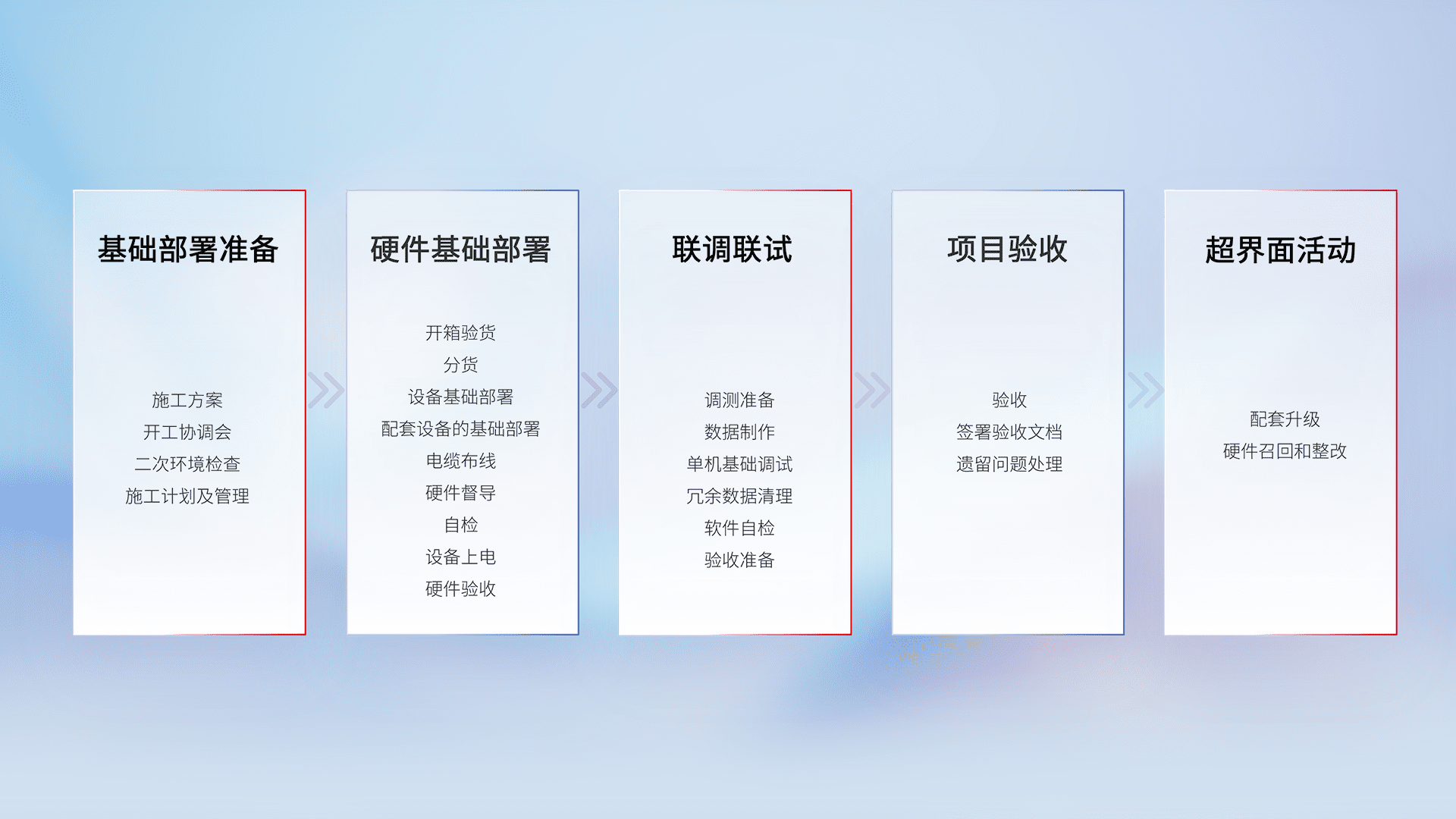 从基础部署准备、、、、硬件基础部署、、、联调联试、、项目验收、、、越界面活动的全过程可追溯,,保证施工质量和进度。。。