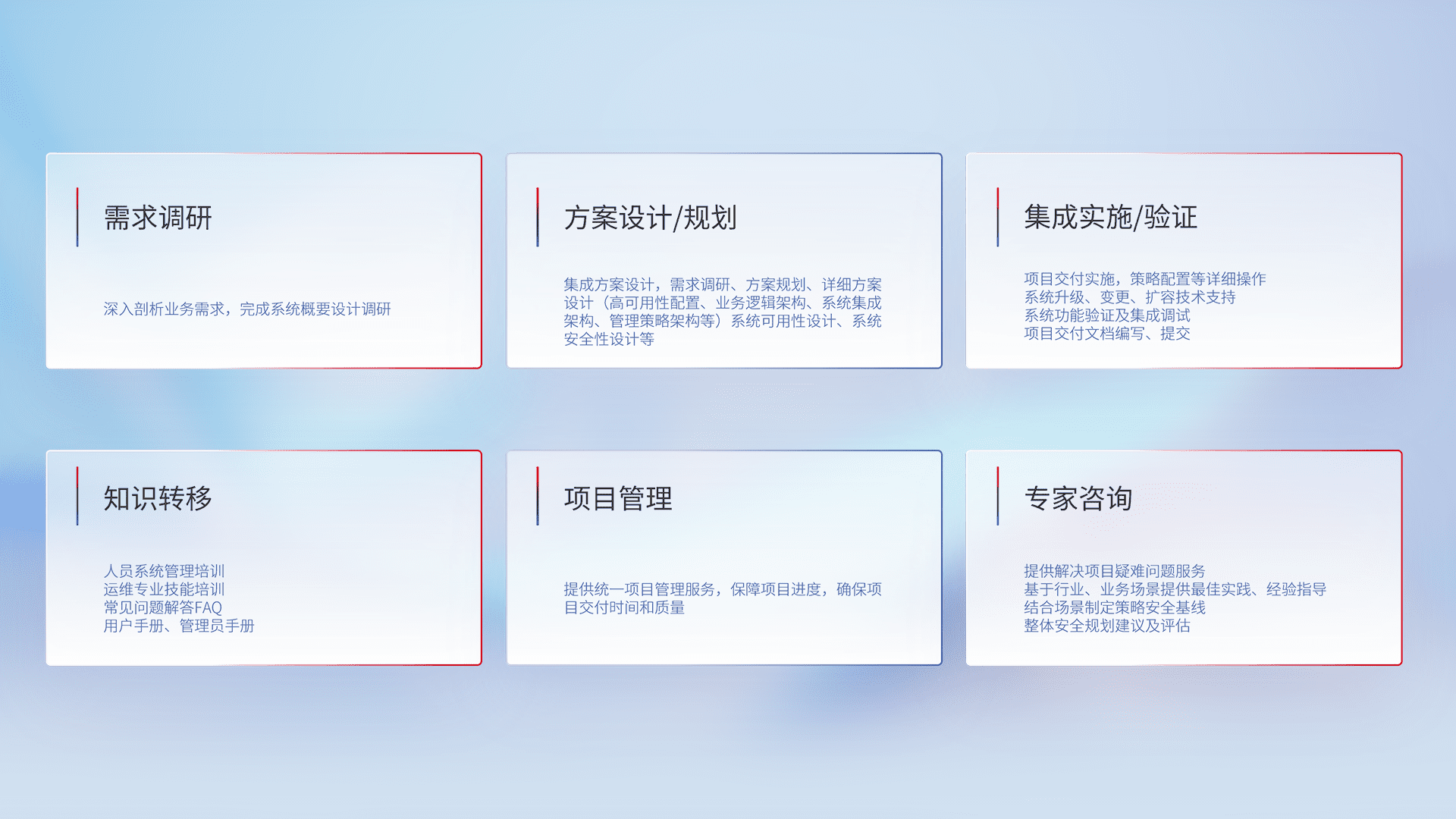 针对客户行业特性,,将宏观的安全战略和需求,,,通过专业的交付服务,,实现项目落地,,,为客户提供标准规范的集成交付服务。。。